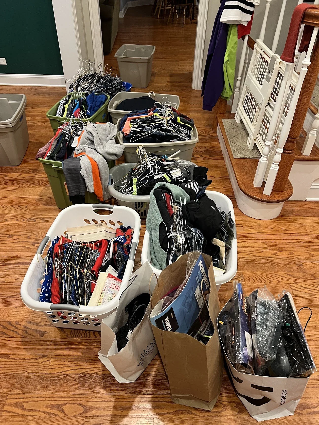 Separate tagged clothes into by their category (we will ask you to bring your items to each area upon arrival to the gym).