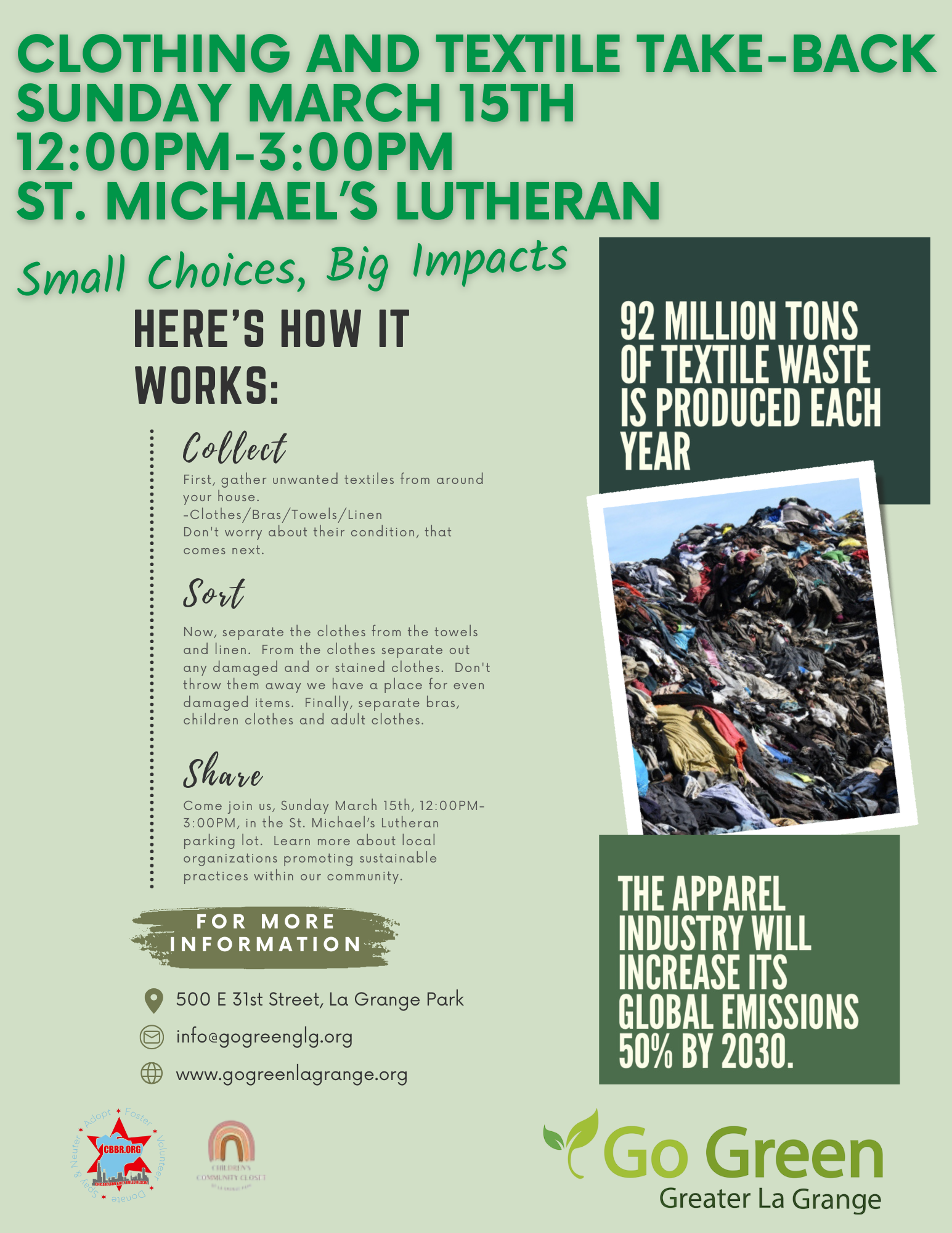 Look over your items carefully for stains, holes, worn knees, missing buttons, or broken zippers. (If any of these issues can’t be fixed, you can donate these items to Go Green Greater La Grange at their textile take-back event on Sunday, March 15th. )